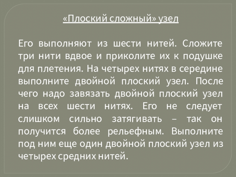 и приколите их к подушке для плетения. На четырех нитях в середине выполните двойной плоский узел. После чего надо завязать двойной плоский узел на всех шести нитях. Его не следует слишком сильно затягивать – так он получится более рельефным. Выполните под ним еще один двойной плоский узел из четырех средних нитей.