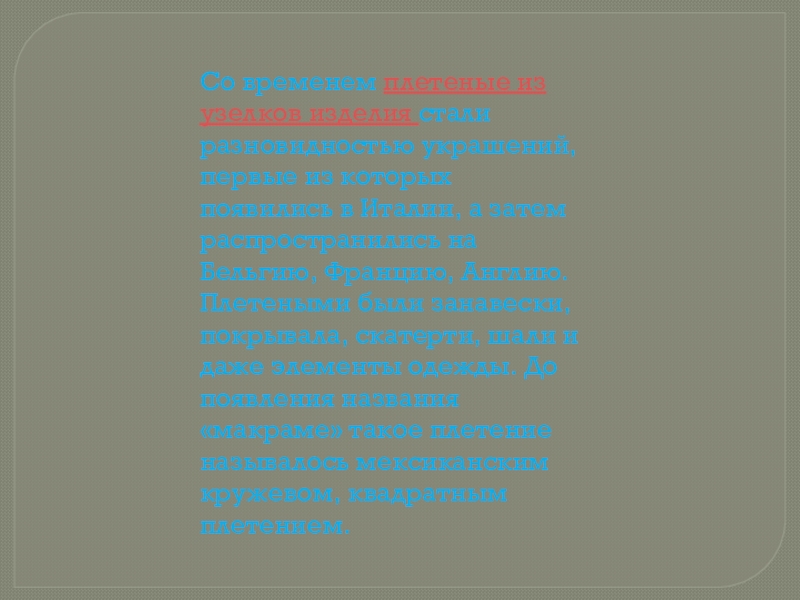 в Италии, а затем распространились на Бельгию, Францию, Англию. Плетеными были занавески, покрывала, скатерти, шали и даже элементы одежды. До появления названия «макраме» такое плетение называлось мексиканским кружевом, квадратным плетением.