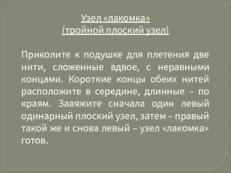 сложенные вдвое, с неравными концами. Короткие концы обеих нитей расположите в середине, длинные – по краям. Завяжите сначала один левый одинарный плоский узел, затем – правый такой же и снова левый – узел «лакомка» готов.