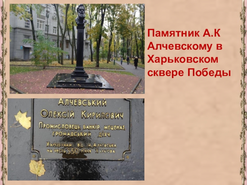 Слайд 12Памятник А.К Алчевскому в Харьковском сквере Победы