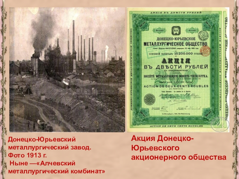 Донецко-Юрьевский металлургический завод. Фото 1913 г. Ныне —«Алчевский металлургический комбинат»Акция Донецко-Юрьевского акционерного общества