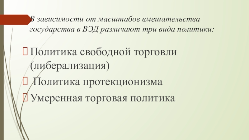 Слайд 9В зависимости от масштабов вмешательства государства в ВЭД различают три вида