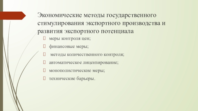 Слайд 19Экономические методы государственного стимулирования экспортного производства и развития экспортного потенциала