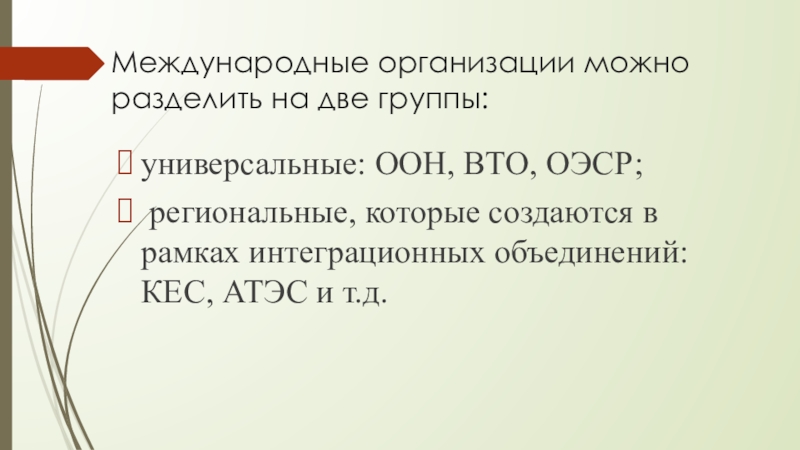 региональные, которые создаются в рамках интеграционных объединений: КЕС, АТЭС и т.д.