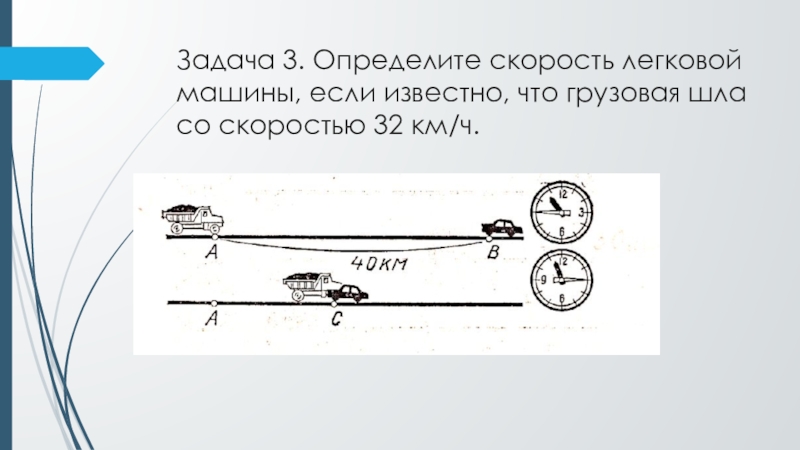 Слайд 17Задача 3. Определите скорость легковой машины, если известно, что грузовая шла