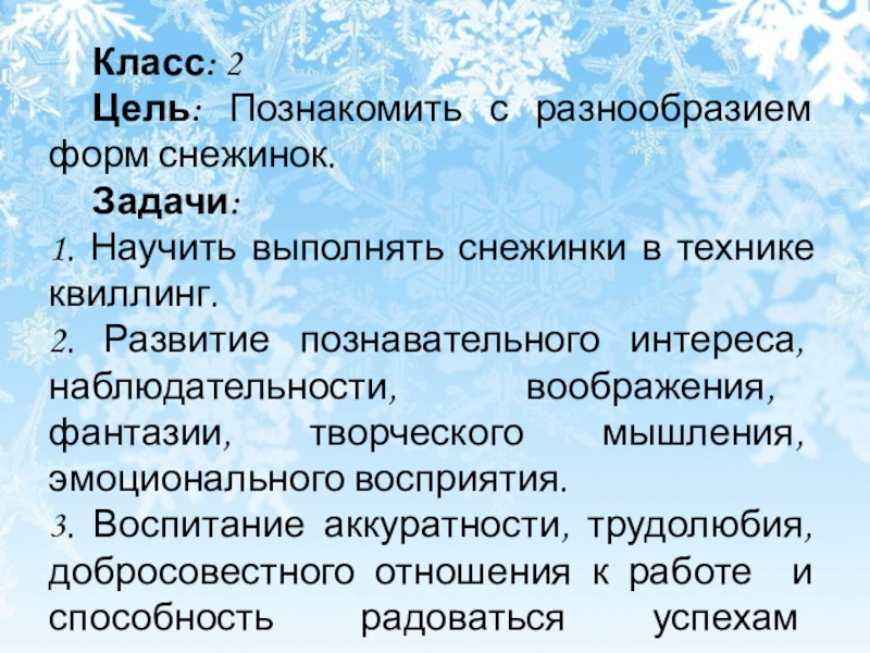 Класс: 2 Цель: Познакомить с разнообразием форм снежинок. Задачи:1. Научить выполнять снежинки в технике квиллинг.2. Развитие познавательного интереса, наблюдательности, воображения, фантазии, творческого мышления, эмоционального восприятия.3. Воспитание аккуратности, трудолюбия, добросовестного отношения к работе и способность радоваться успехам одноклассников.