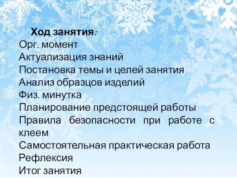Ход занятия:Орг. моментАктуализация знанийПостановка темы и целей занятияАнализ образцов изделийФиз. минуткаПланирование предстоящей работыПравила безопасности при работе с
