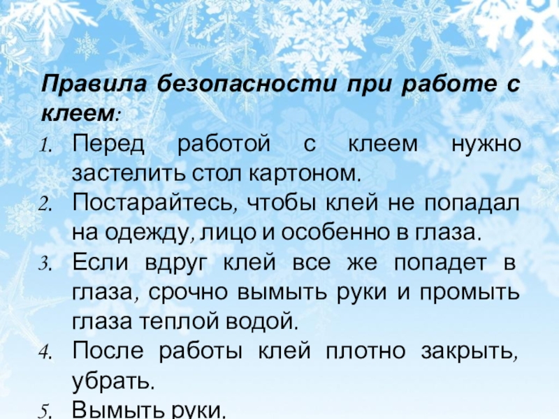 Правила безопасности при работе с клеем:Перед работой с клеем нужно застелить стол картоном.Постарайтесь, чтобы клей не попадал
