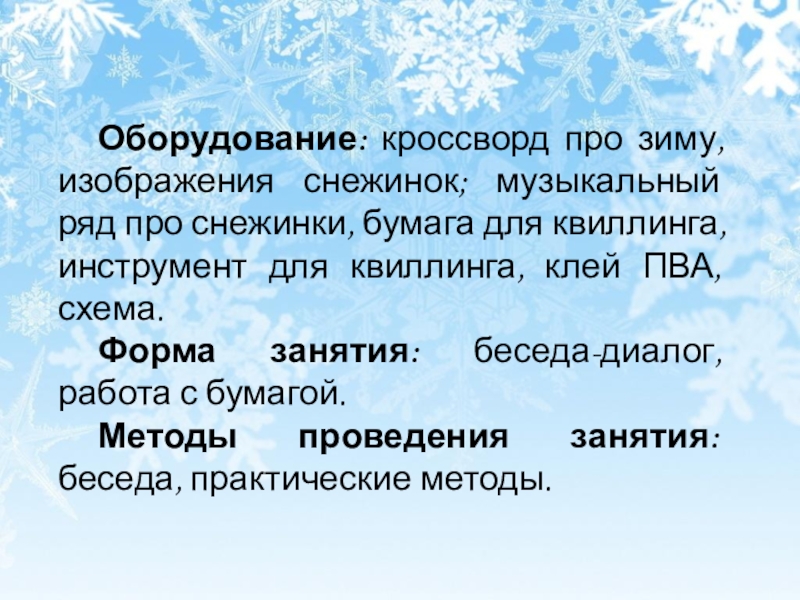 Оборудование: кроссворд про зиму, изображения снежинок; музыкальный ряд про снежинки, бумага для квиллинга, инструмент для квиллинга, клей