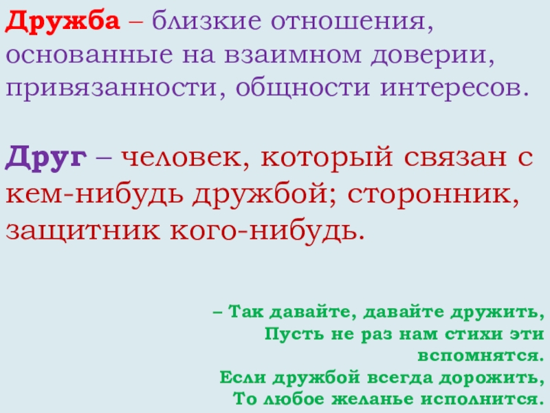 Дружба – близкие отношения, основанные на взаимном доверии, привязанности, общности интересов.