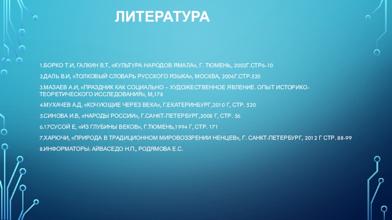 1.Борко Т.И, Галкин В.Т, «Культура народов Ямала», г. Тюмень, 2002г.стр6-10
