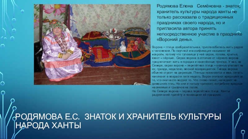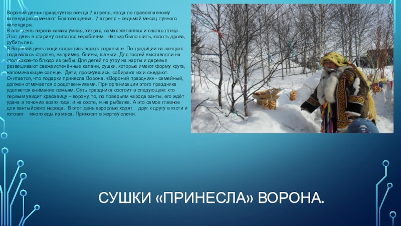 На Севере ворона – первая перелётная птица. Ханты радуются её прилёту и посвящают ей праздник.