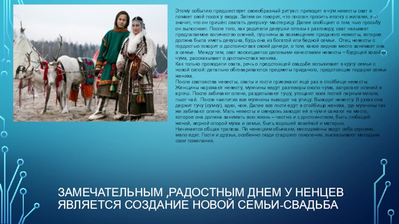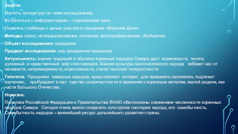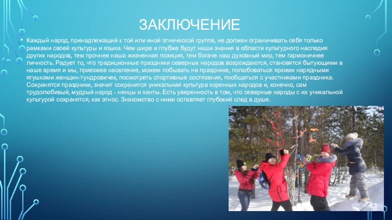 Каждый народ, принадлежащий к той или иной этнической группе, не должен ограничивать себя только рамками своей культуры и языка. Чем шире и глубже будут наши знания в области культурного наследия других народов, тем прочнее наша жизненная позиция, тем богаче наш духовный мир, тем гармоничнее личность. Радует то, что традиционные праздники северных народов возрождаются, становятся бытующими в наше время и мы, приезжее население, можем побывать на празднике, полюбоваться яркими нарядными ягушками женщин-тундровичек, посмотреть спортивные состязания, пообщаться с участниками праздника. Сохранятся праздники, значит сохранится уникальная культура коренных народов и, конечно, сам трудолюбивый, мудрый народ - ненцы и ханты. Есть уверенность в том, что северные народы с их уникальной культурой сохранятся, как этнос. Знакомство с ними оставляет глубокий след в душе.