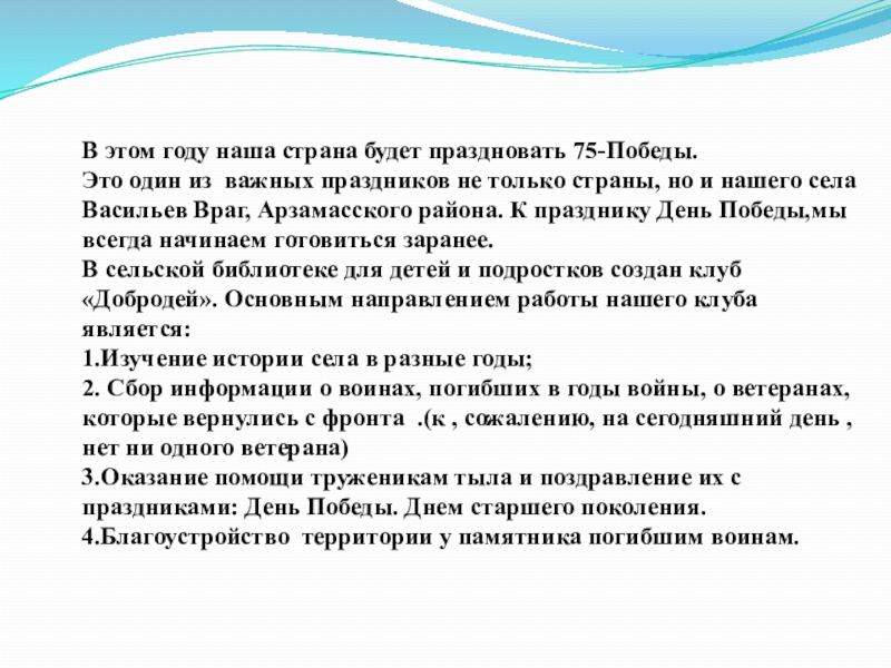 праздников не только страны, но и нашего села Васильев Враг, Арзамасского района. К празднику День Победы,мы всегда начинаем готовиться заранее.