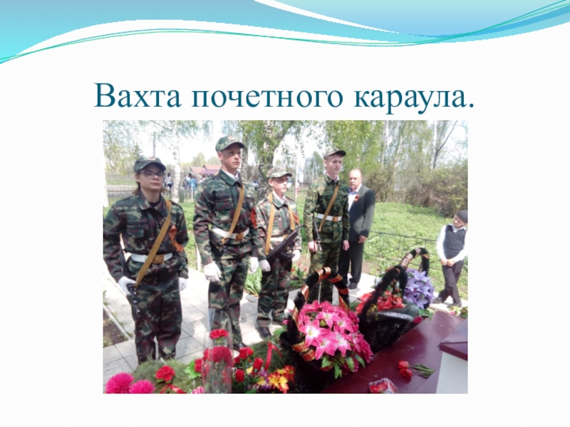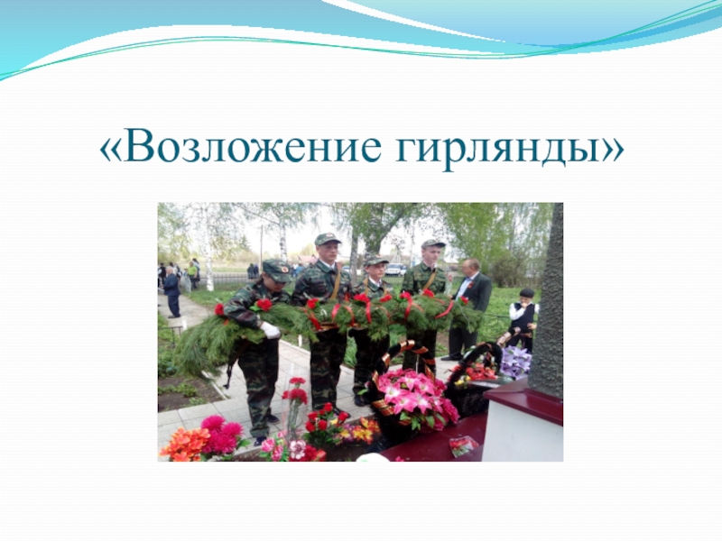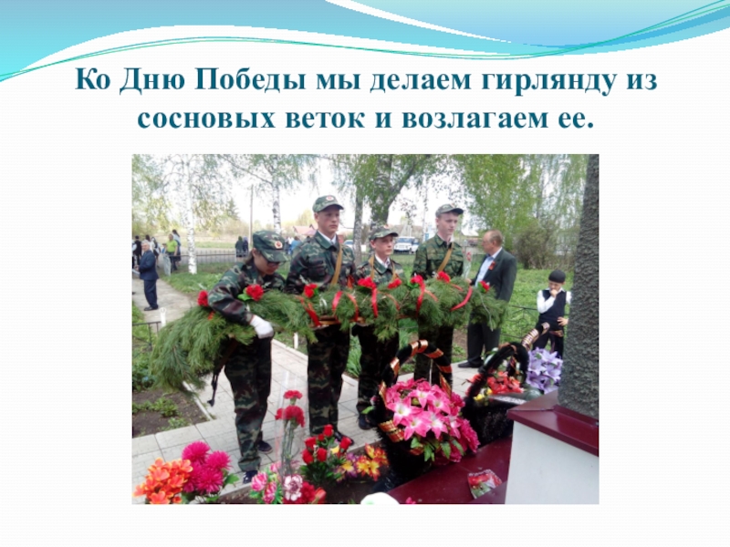 Слайд 10Ко Дню Победы мы делаем гирлянду из сосновых веток и возлагаем