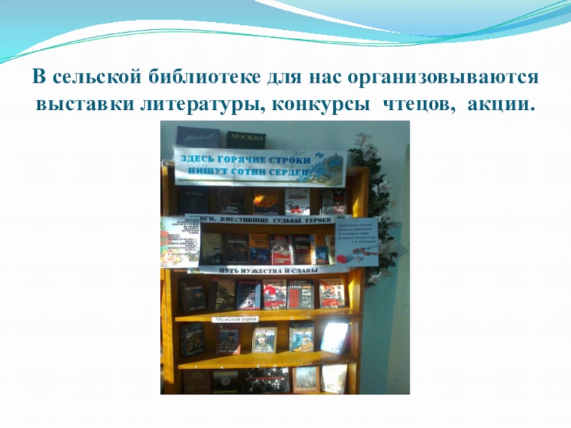 Слайд 7В сельской библиотеке для нас организовываются выставки литературы, конкурсы чтецов, акции.