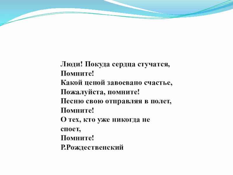 Люди! Покуда сердца стучатся, Помните! Какой ценой завоевано счастье, Пожалуйста, помните! Песню свою отправляя в полет,