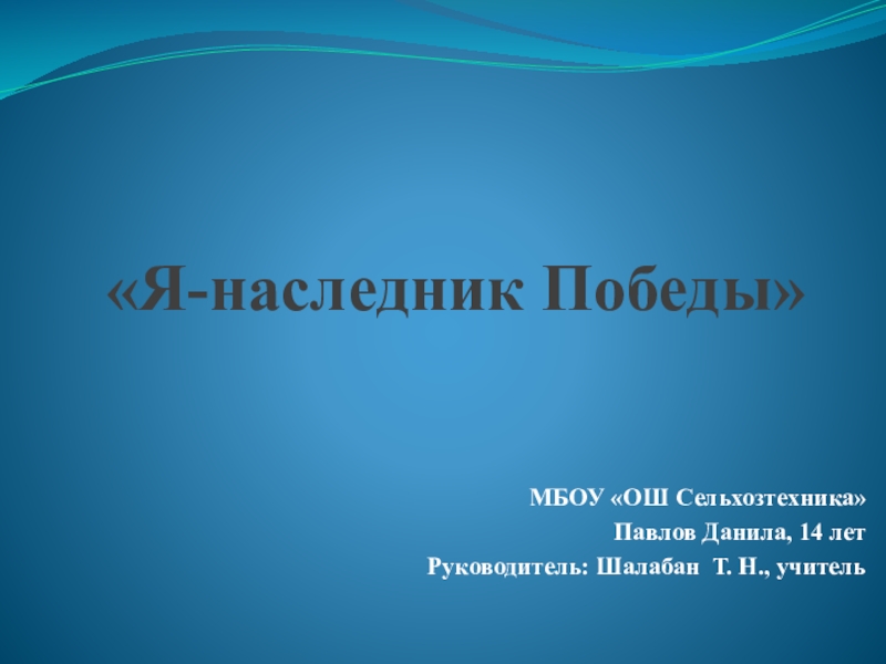 «Я-наследник Победы» МБОУ «ОШ Сельхозтехника»Павлов Данила, 14 летРуководитель: Шалабан Т. Н., учитель