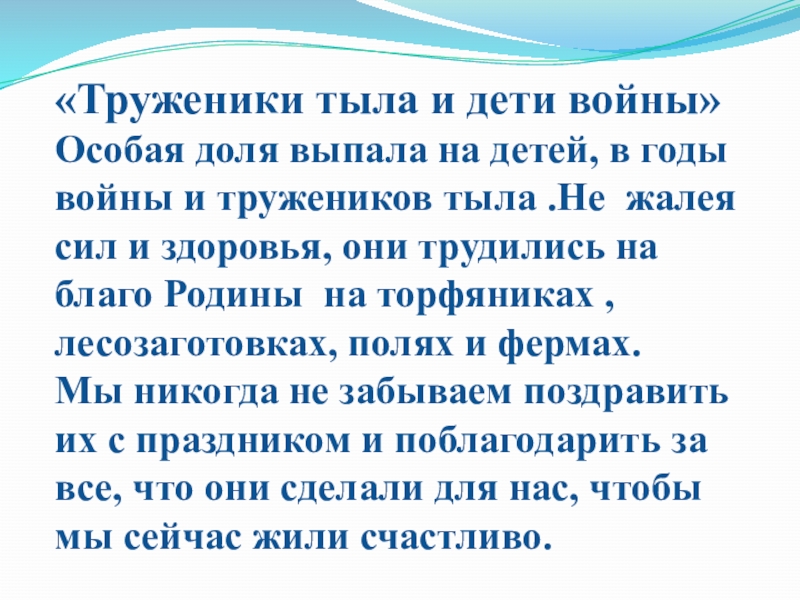 войны и тружеников тыла .Не жалея сил и здоровья, они трудились на благо Родины на торфяниках , лесозаготовках, полях и фермах.
