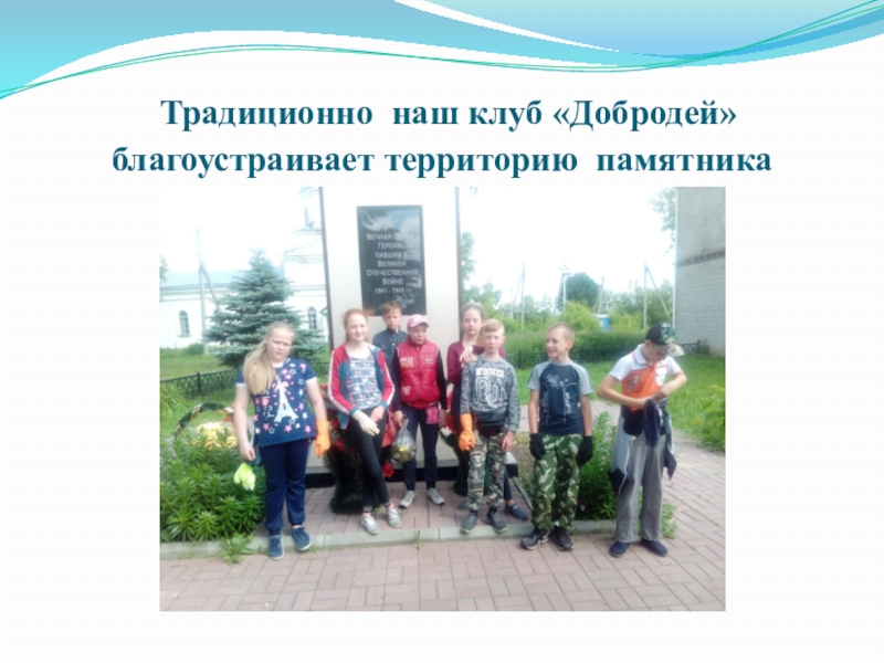 Слайд 5 Традиционно наш клуб «Добродей» благоустраивает территорию памятника