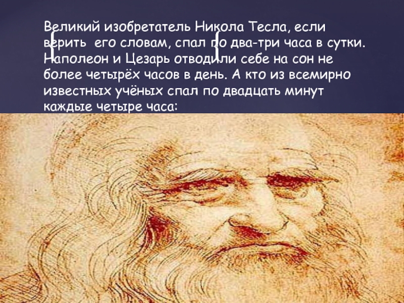 Слайд 16Великий изобретатель Никола Тесла, если верить его словам, спал по два-три