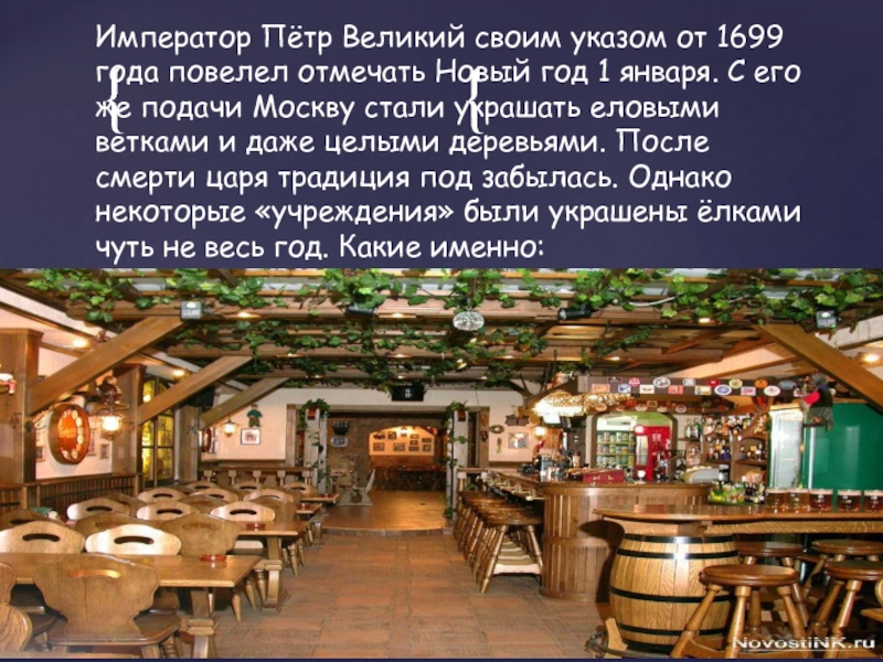 год 1 января. С его же подачи Москву стали украшать еловыми ветками и даже целыми деревьями. После смерти царя традиция под забылась. Однако некоторые «учреждения» были украшены ёлками чуть не весь год. Какие именно: