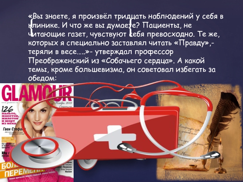 что же вы думаете? Пациенты, не читающие газет, чувствуют себя превосходно. Те же, которых я специально заставлял читать «Правду»,- теряли в весе…..»- утверждал профессор Преображенский из «Собачьего сердца». А какой темы, кроме большевизма, он советовал избегать за обедом: