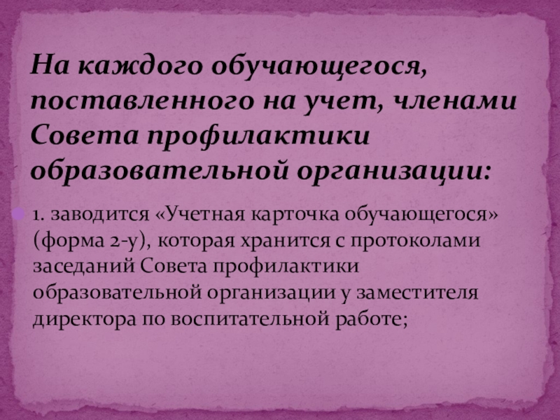 На каждого обучающегося, поставленного на учет, членами Совета профилактики образовательной организации: