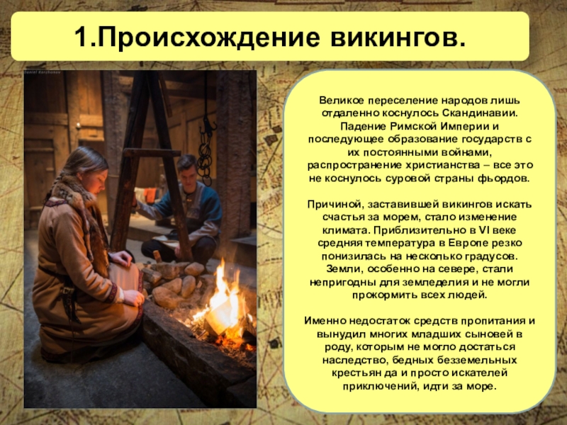 Причиной, заставившей викингов искать счастья за морем, стало изменение климата. Приблизительно в VI веке средняя температура в Европе резко понизилась на несколько градусов. Земли, особенно на севере, стали непригодны для земледелия и не могли прокормить всех людей.