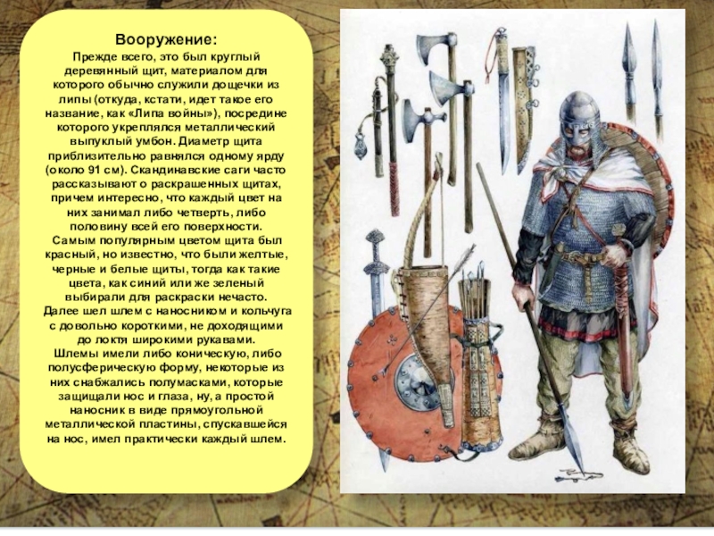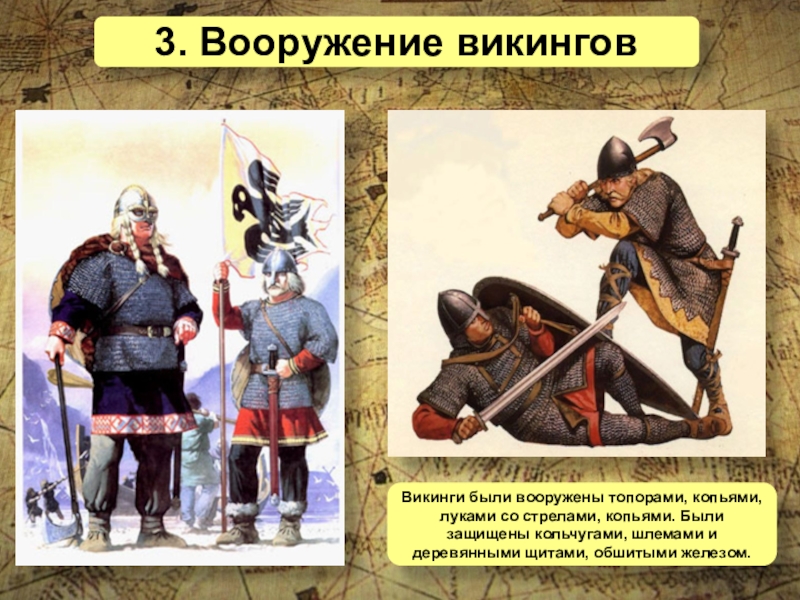 Викинги были вооружены топорами, копьями, луками со стрелами, копьями. Были защищены кольчугами, шлемами и деревянными щитами, обшитыми железом.