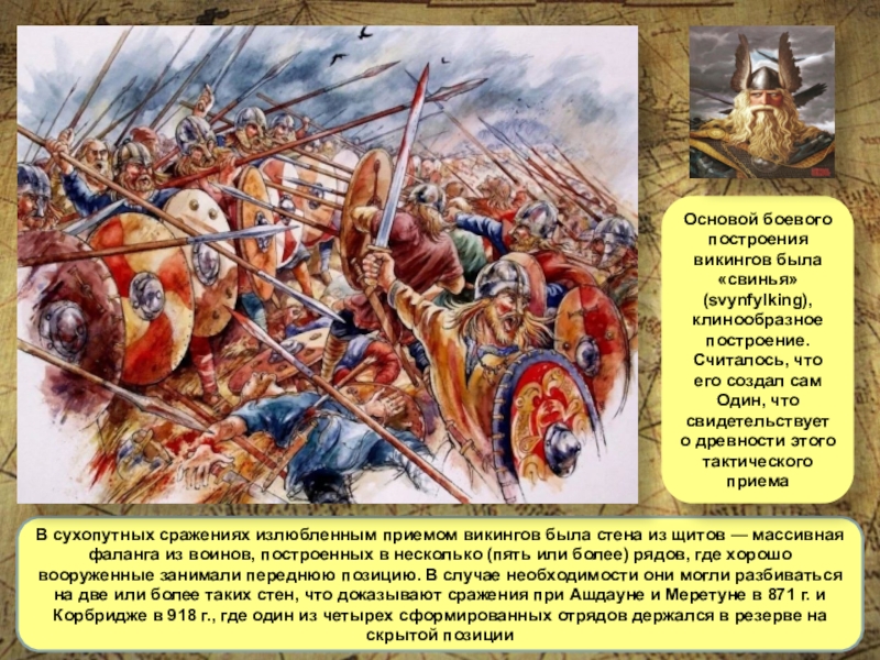 В сухопутных сражениях излюбленным приемом викингов была стена из щитов — массивная фаланга из воинов, построенных в несколько (пять или более) рядов, где хорошо вооруженные занимали переднюю позицию. В случае необходимости они могли разбиваться на две или более таких стен, что доказывают сражения при Ашдауне и Меретуне в 871 г. и Корбридже в 918 г., где один из четырех сформированных отрядов держался в резерве на скрытой позиции