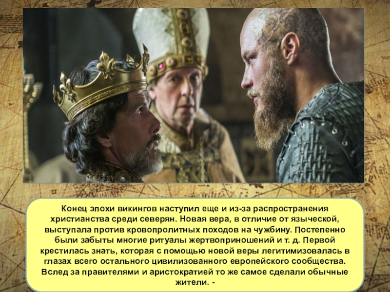 Конец эпохи викингов наступил еще и из-за распространения христианства среди северян. Новая вера, в отличие от языческой, выступала против кровопролитных походов на чужбину. Постепенно были забыты многие ритуалы жертвоприношений и т. д. Первой крестилась знать, которая с помощью новой веры легитимизовалась в глазах всего остального цивилизованного европейского сообщества. Вслед за правителями и аристократией то же самое сделали обычные жители. -