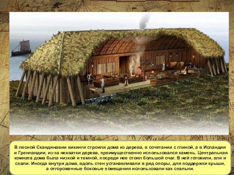 В лесной Скандинавии викинги строили дома из дерева, в сочетании с глиной, а в Исландии и Гренландии, из-за нехватки дерева, преимущественно использовался камень. Центральная комната дома была низкой и темной, посреди нее стоял большой очаг. В ней готовили, ели и спали. Иногда внутри дома, вдоль стен устанавливали в ряд опоры, для поддержки крыши, а отгороженные боковые помещения использовали как спальни.