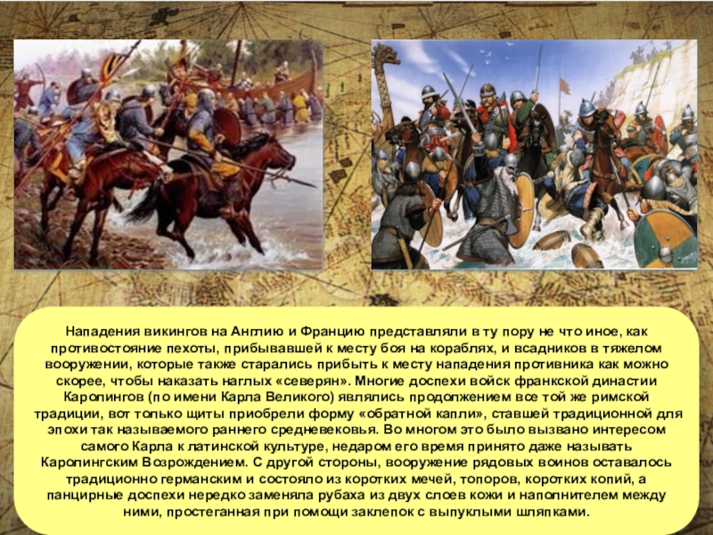 Нападения викингов на Англию и Францию представляли в ту пору не что иное, как противостояние пехоты, прибывавшей к месту боя на кораблях, и всадников в тяжелом вооружении, которые также старались прибыть к месту нападения противника как можно скорее, чтобы наказать наглых «северян». Многие доспехи войск франкской династии Каролингов (по имени Карла Великого) являлись продолжением все той же римской традиции, вот только щиты приобрели форму «обратной капли», ставшей традиционной для эпохи так называемого раннего средневековья. Во многом это было вызвано интересом самого Карла к латинской культуре, недаром его время принято даже называть Каролингским Возрождением. С другой стороны, вооружение рядовых воинов оставалось традиционно германским и состояло из коротких мечей, топоров, коротких копий, а панцирные доспехи нередко заменяла рубаха из двух слоев кожи и наполнителем между ними, простеганная при помощи заклепок с выпуклыми шляпками.