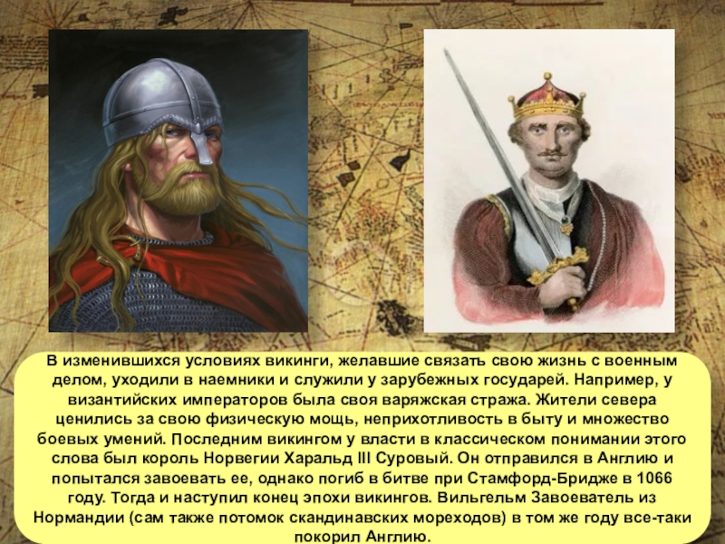 В изменившихся условиях викинги, желавшие связать свою жизнь с военным делом, уходили в наемники и служили у зарубежных государей. Например, у византийских императоров была своя варяжская стража. Жители севера ценились за свою физическую мощь, неприхотливость в быту и множество боевых умений. Последним викингом у власти в классическом понимании этого слова был король Норвегии Харальд III Суровый. Он отправился в Англию и попытался завоевать ее, однако погиб в битве при Стамфорд-Бридже в 1066 году. Тогда и наступил конец эпохи викингов. Вильгельм Завоеватель из Нормандии (сам также потомок скандинавских мореходов) в том же году все-таки покорил Англию.