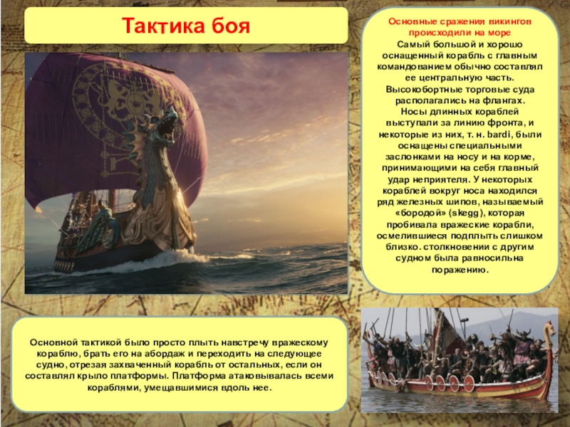 Военным успехам викингов способствовали их необычные корабли – дракары. Эти боевые ладьи вмещали около 20 гребцов, имели небольшую осадку, могли ходить на веслах и под парусом как по морю, так и по руслам рек, причем даже самых мелких.