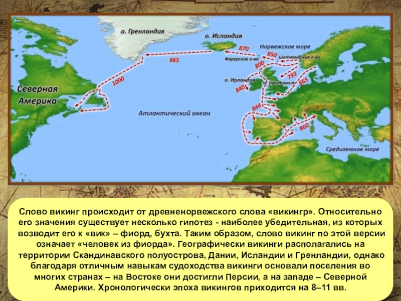 Слово викинг происходит от древненорвежского слова «викингр». Относительно его значения существует несколько гипотез - наиболее убедительная, из которых возводит его к «вик» – фиорд, бухта. Таким образом, слово викинг по этой версии означает «человек из фиорда». Географически викинги располагались на территории Скандинавского полуострова, Дании, Исландии и Гренландии, однако благодаря отличным навыкам судоходства викинги основали поселения во многих странах – на Востоке они достигли Персии, а на западе – Северной Америки. Хронологически эпоха викингов приходится на 8–11 вв.