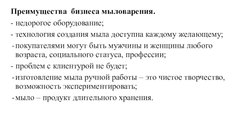 Преимущества  бизнеса мыловарения.- недорогое оборудование; - технология создания мыла доступна каждому желающему; покупателями могут быть мужчины и
