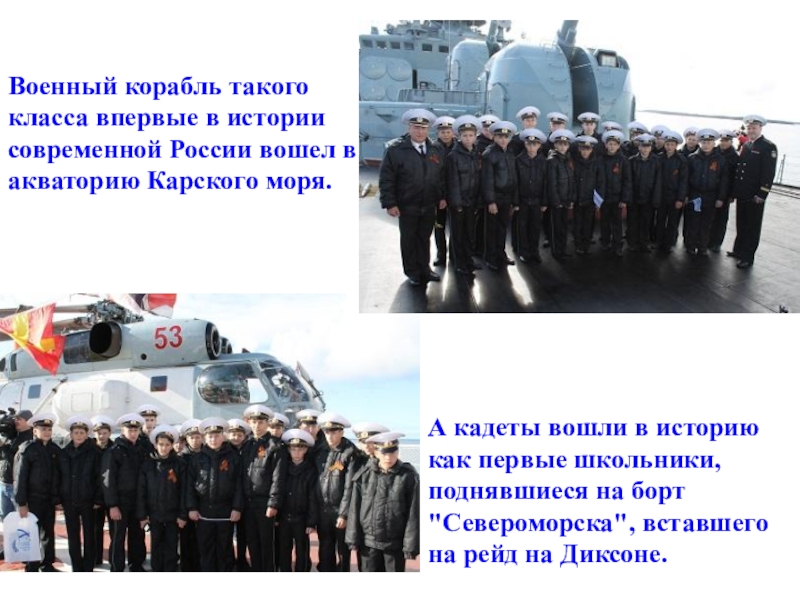 А кадеты вошли в историю как первые школьники, поднявшиеся на борт "Североморска", вставшего на рейд на Диксоне.