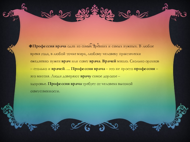 в любой точке мира, любому человеку практически ежедневно нужен врач или совет врача. Врачей много. Сколько органов – столько и врачей. ... Профессия врача – это не просто профессия – это миссия. Люди доверяют врачу самое дорогое – здоровье. Профессия врача требует от человека высокой ответственности.