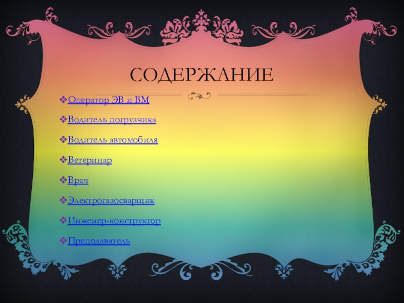СодержаниеОператор ЭВ и ВМВодитель погрузчикаВодитель автомобиляВетеринарВрачЭлектрогазосварщикИнженер-конструкторПреподаватель