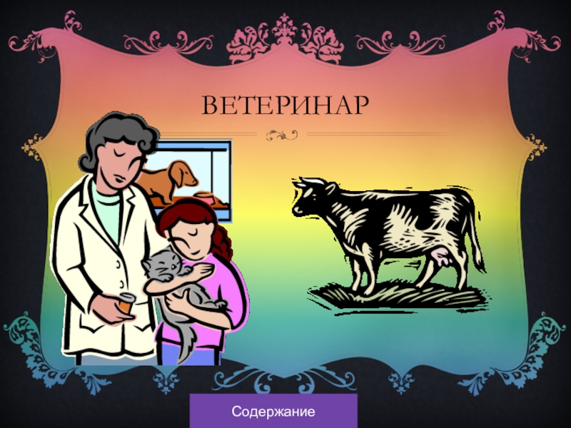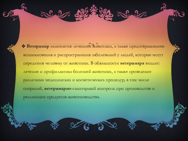 Слайд 10 Ветеринар занимается лечением животных, а также предотвращением возникновения и распространения заболеваний у
