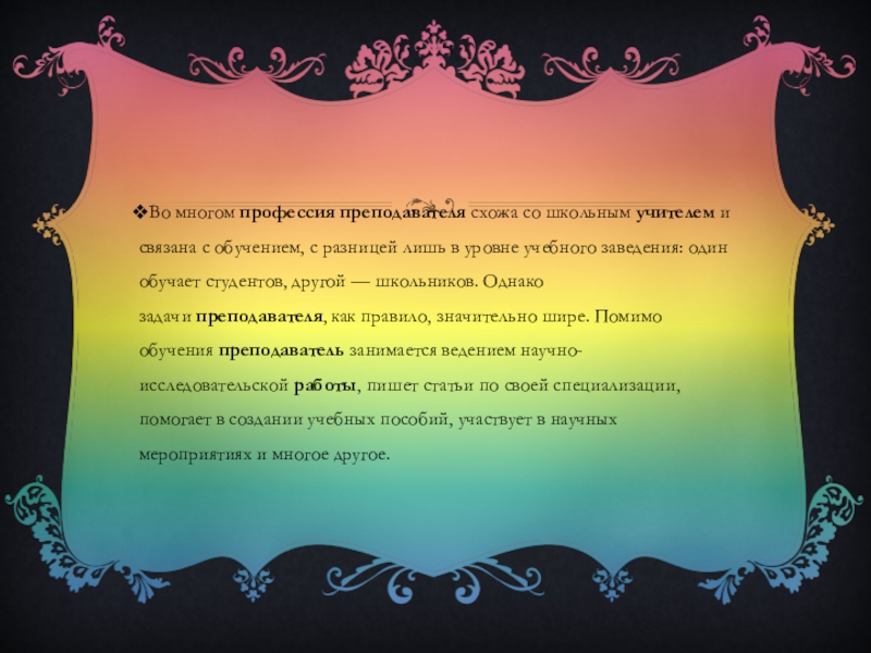 Слайд 18Во многом профессия преподавателя схожа со школьным учителем и связана с обучением, с разницей лишь в