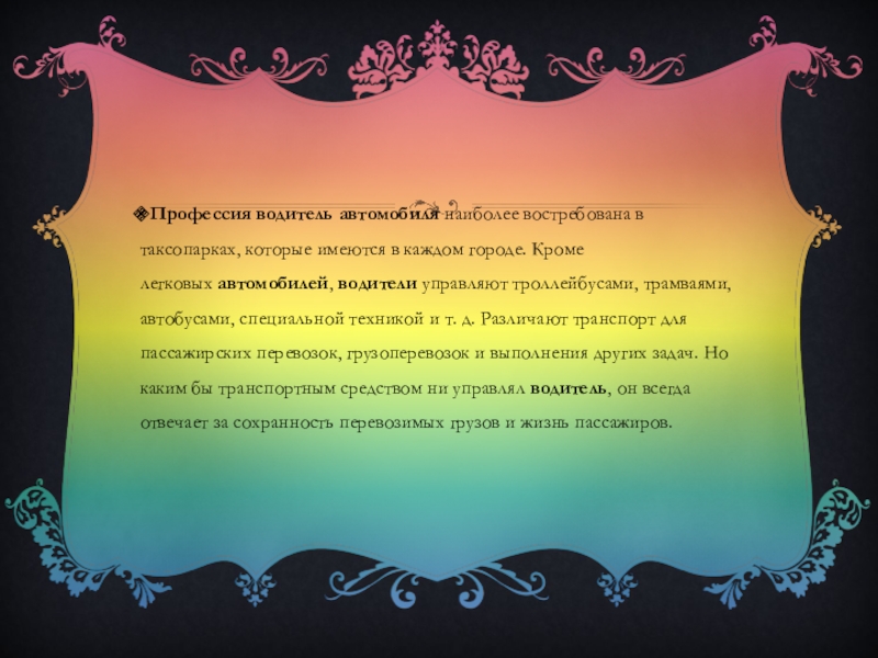 Слайд 8Профессия водитель автомобиля наиболее востребована в таксопарках, которые имеются в каждом городе. Кроме легковых автомобилей, водители управляют