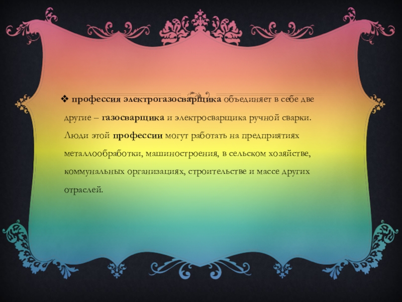Слайд 14 профессия электрогазосварщика объединяет в себе две другие – газосварщика и электросварщика ручной сварки. Люди этой профессии могут