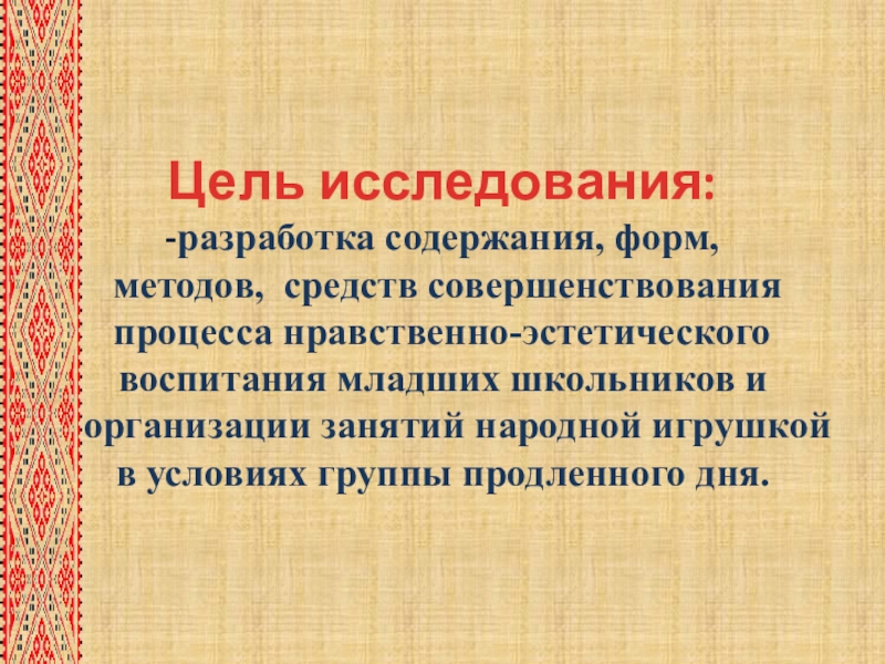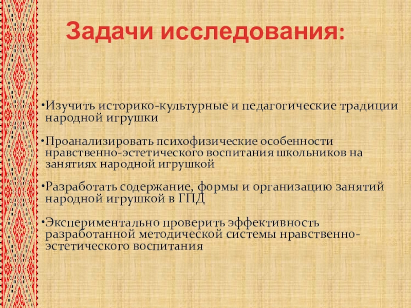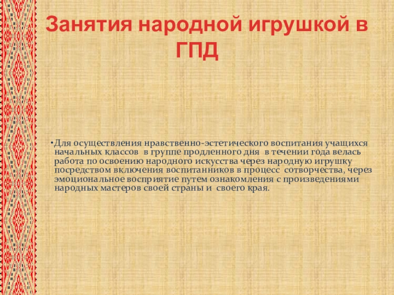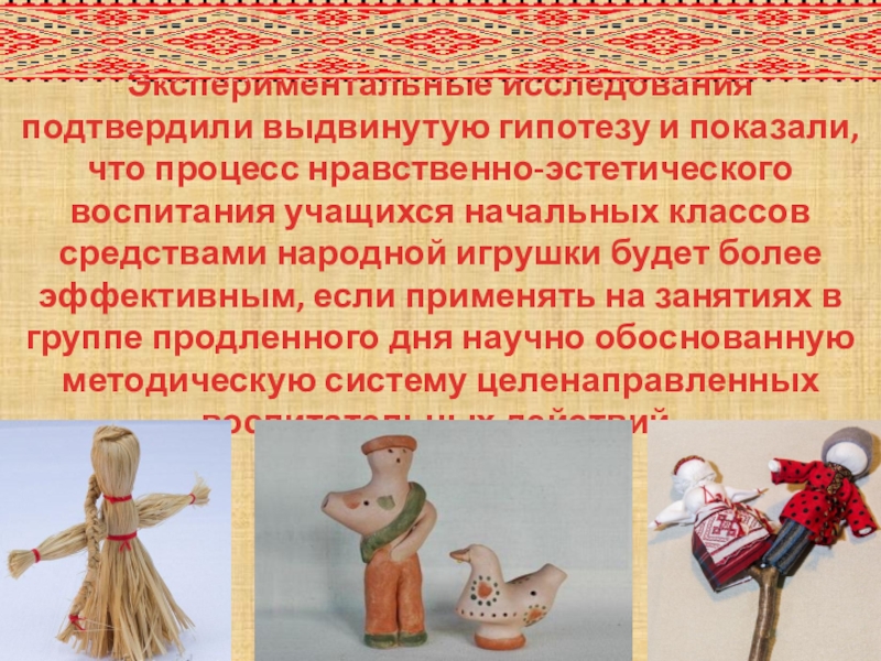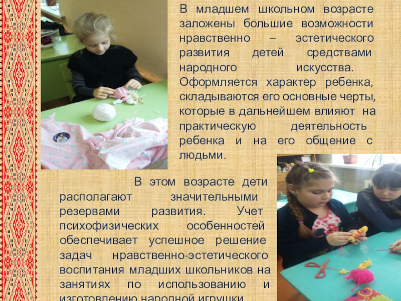В этом возрасте дети располагают значительными резервами развития. Учет психофизических особенностей обеспечивает успешное решение задач нравственно-эстетического воспитания младших школьников на занятиях по использованию и изготовлению народной игрушки.