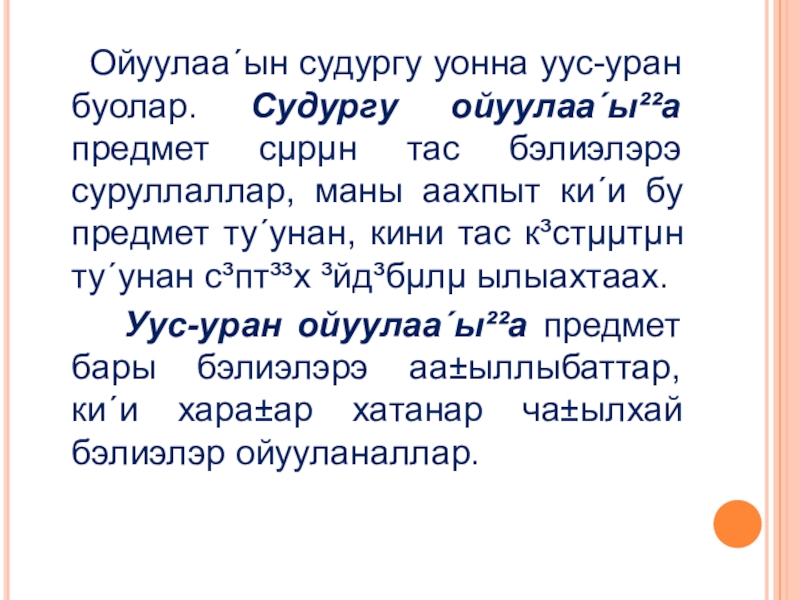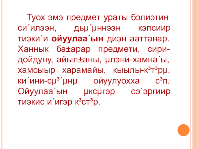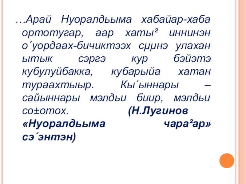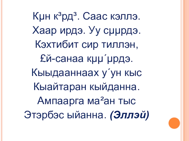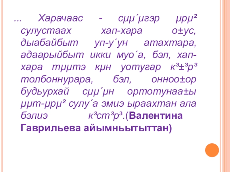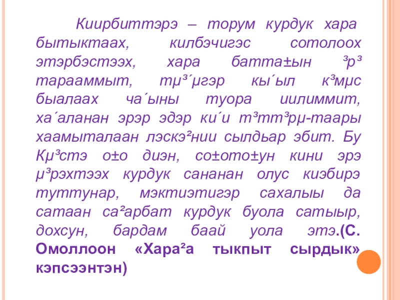 Кэтэх хара тыа±а кэрэ са²алаах кэ±э кыылым барахсан, ³т³р буола-буола, этэн чоргутара. С³п буола-буола онно-манна саа тыа´а бµ´µргµµрэ. (Анна Неустроева «Тиргэ´иттэр» кэпсээнтэн)