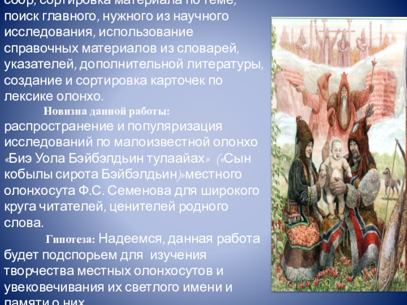 Новизна данной работы: распространение и популяризация исследований по малоизвестной олонхо «Биэ Уола Бэйбэлдьин тулаайах» («Сын кобылы сирота Бэйбэлдьин)»местного олонхосута Ф.С. Семенова для широкого круга читателей, ценителей родного слова.