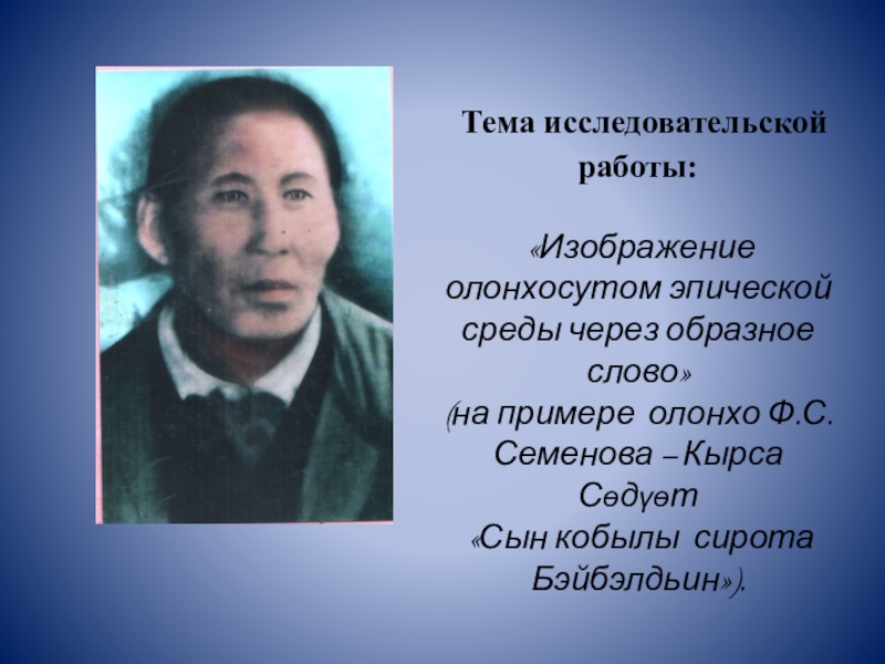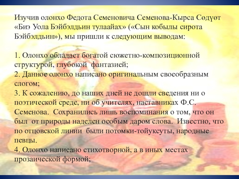 Слайд 6Изучив олонхо Федота Семеновича Семенова-Кырса Сөдүөт «Биэ Уола Бэйбэлдьин тулаайах» («Сын