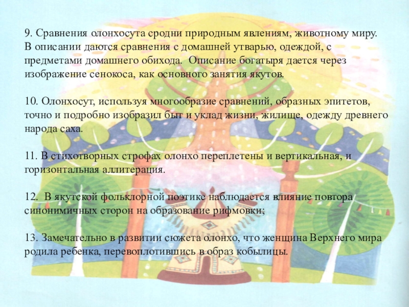 10. Олонхосут, используя многообразие сравнений, образных эпитетов, точно и подробно изобразил быт и уклад жизни, жилище, одежду древнего народа саха.